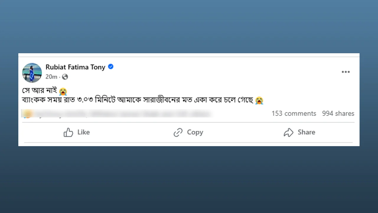 আবেগঘন এক পোস্ট দিয়ে তিনি লিখেছেন, ‘সে আর নাই। ব্যাংকক সময় রাত ৩.০৩ মিনিটে আমাকে সারাজীবনের মত একা করে চলে গেছে।’