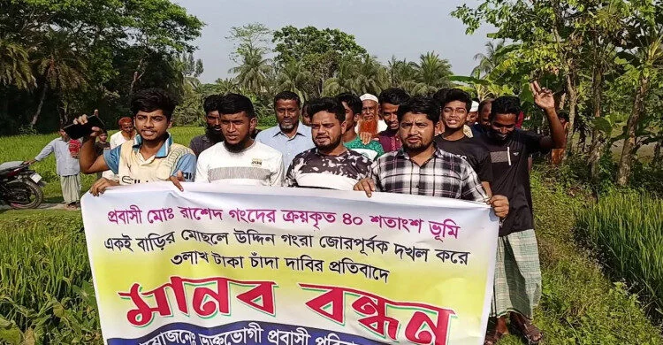 এসময় ভূক্তভোগী পরিবারের সদস্যরা বলেন, গত ১০ ডিসেম্বর ২০২৪ ইং সনে ছাপ কবলা মূলে উপজেলার ধর্মপুর ইউনিয়নের ভাটিরটেক মৌজায় ৪০ শতাংশ জায়গা খরিদ করেন প্রবাসী মো. রাসেদ, মো. সাহেদ ও মো. শামীম। জায়গা ক্রয় করার পর বিক্রেতা দখল বুঝিয়ে দিতে গেলে একই বাড়ির মোছলে উদ্দিন নিজেকে যুবদল নেতা পরিচয় দিয়ে রাজনৈতিক প্রভাব খাটিয়ে জমিতে জোরপূর্বক হালচাষ দিয়ে বোরোধান রোপন করে দেন। পরবর্তীতে জায়গা ছাড়তে বললে প্রবাসী পরিবারের কাছে জায়গা ছাড়তে হলে ৩লাখ টাকার চাঁদা দাবি করেন মোছলে উদ্দিন। এ নিয়ে একাধিকবার বাকবিতন্ডার ঘটনাও ঘটেছে। এমতবস্থায় চাঁদাবাজদের কবল থেকে জমি ফেরত চান ভূক্তভোগী প্রবাসী পরিবারের সদস্যরা। মানববন্ধনে উপস্থিত থেকে এই চাঁদাবাজের বিচার চেয়ে জমি বিক্রেতা আবুল হোসেন বলেন, আমি ছাপ কবলামূলে জায়গা বিক্রি করার পর দখল দিতে আসলে মোছলে উদ্দিন গংরা রাজনৈতিক প্রভাব খাটিয়ে জমিটি দখল করে নিয়ে জমিতে ধান চাষ করে এখন প্রবাসীদের কাছে ৩লাখ টাকা চাঁদা দাবি করছে। এবিষয়ে স্থানীয় ইউনিয়ন পরিষদে অভিযোগ করেও এখনো কোন প্রতিকার পাইনি আমরা।