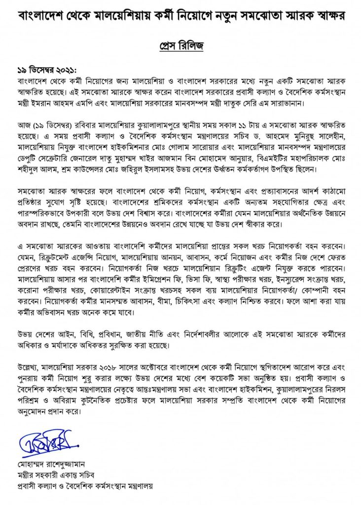সব সেক্টরে বাংলাদেশ থেকে কর্মী নিয়োগের জন্য মালয়েশিয়া ও বাংলাদেশ সরকারের মধ্যে সমঝোতা স্মারক স্বাক্ষরিত হয়েছে। সমঝোতা স্মারকে স্বাক্ষর করেন বাংলাদেশ সরকারের প্রবাসীকল্যাণ ও বৈদেশিক কর্মসংস্থান মন্ত্রী ইমরান আহমদ এমপি এবং মালয়েশিয়া সরকারের মানব সম্পদ মন্ত্রী দাতুক সেরি এম সারাভানান।