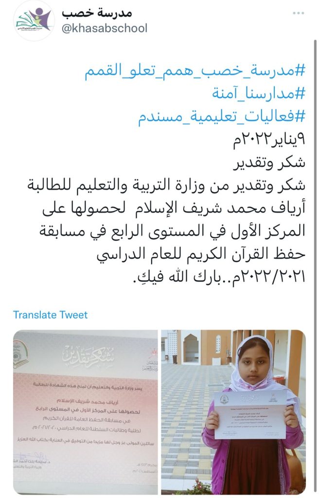 ওমানের শিক্ষা মন্ত্রণালয় কর্তৃক আয়োজিত ২০২১/২০২২ শিক্ষা বর্ষের কোরআন প্রতিযোগিতায় বর্ষসেরা হলেন বাংলাদেশী শিশু আরিয়াফ। তার দেশের বাড়ি বাড়ী চট্টগ্রামের সন্দ্বীপ উপজেলায়৷ আরিয়াফের পিতা বর্তমানে ওমানের “জেনারেল ডিপার্টমেন্ট অব কোর্টস” এর একমাত্র লাইসেন্স প্রাপ্ত অফিসিয়াল ইন্টারপ্রেটার হিসেবে কর্মরত আছেন।