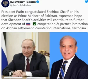 পাকিস্তানের নতুন প্রধানমন্ত্রী নির্বাচিত হওয়ায় শাহবাজ শরিফকে মঙ্গলবার (১২ এপ্রিল) অভিনন্দন জানিয়েছেন রাশিয়ার প্রেসিডেন্ট ভ্লাদিমির পুতিন। পাকিস্তানে রুশ দূতাবাস বলছে, পুতিন আশা প্রকাশ করেছেন যে শাহবাজের নেতৃত্ব, পাকিস্তান-রাশিয়া সহযোগিতামূলক উন্নয়ন এবং আন্তর্জাতিক সন্ত্রাসবাদ মোকাবিলায় অংশীদার হিসেবে অবদান রাখবে।