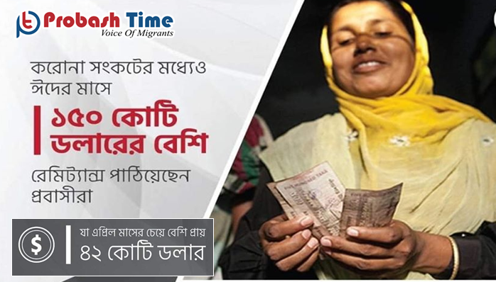 মহামারী করোনা সংকটের মধ্যেও ঈদের মাসে ১৫০ কোটি ডলারের বেশি রেমিট্যান্স পাঠিয়েছেন প্রবাসীরা। সদ্য সমাপ্ত মে মাসে ১৫০ কোটি ৩০ লাখ (১.৫ বিলিয়ন) ডলার রেমিট্যান্স পাঠিয়েছেন প্রবাসীরা। যা গত এপ্রিল মাসের চেয়ে ৪১ কোটি ৬৬ লাখ ডলার বেশি। বাংলাদেশ ব্যাংকের হালনাগাদ প্রতিবেদনে এই তথ্য তুলে ধরা হয়েছে।