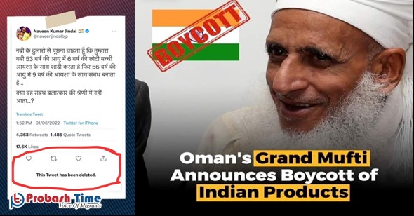 ভারতে হযরত মুহম্মদ (সা.) কে নিয়ে বিজেপির উত্তর প্রদেশ শাখার দুই মুখপাত্রের মন্তব্যের জেরে ক্ষুব্ধ প্রতিক্রিয়া জানিয়েছে সৌদি আরবসহ মধ্যপ্রাচ্যের কয়েকটি উপসাগরীয় দেশ। কুয়েত ও কাতারে রীতিমত ভারতীয় দূতকে তলব করে প্রকাশ করা হয়েছে ক্ষোভ। ওমানের গ্র্যান্ড মুফতি বলেন, এ ধরণের জঘন্য অপমানে চুপ থাকবেনা মুসলিম বিশ্ব। একইসাথে তীব্র নিন্দা জানিয়েছে পাকিস্তান ও ইরানের রাষ্ট্রীয় গ্র্যান্ড মুফতি।