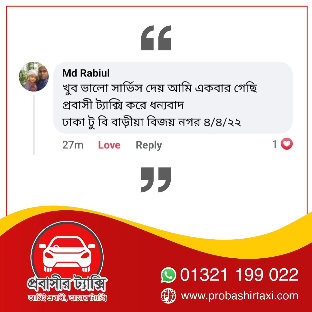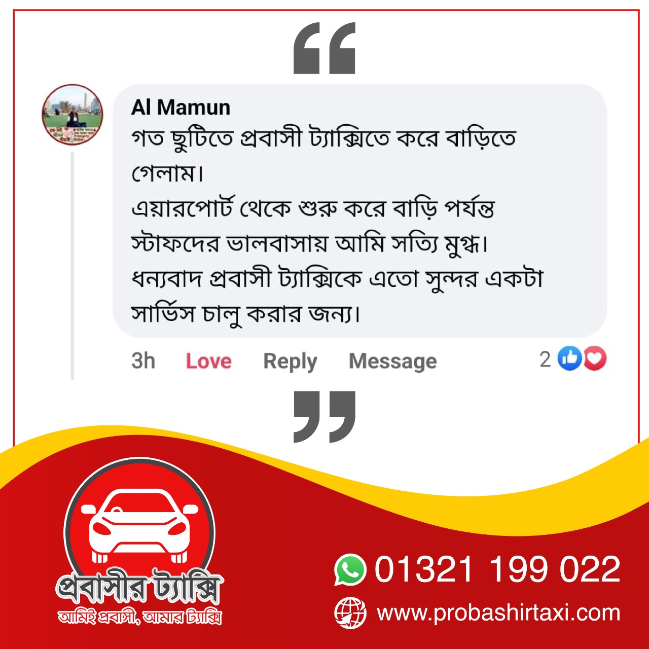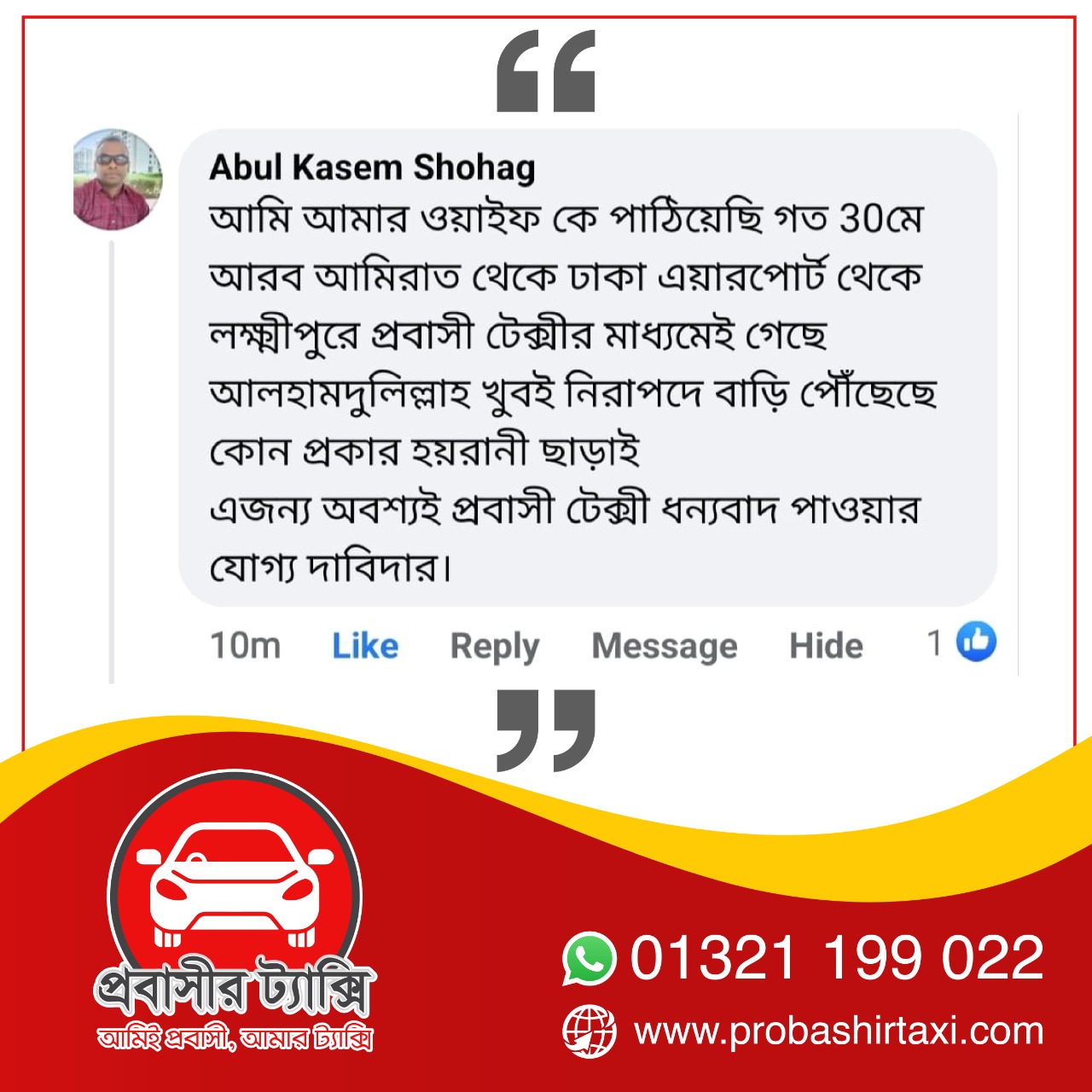 তবে এবার আসার আলো দেখাচ্ছে প্রবাস ফেরত কয়েকজন যুবকের উদ্যোগে প্রতিষ্ঠিত প্রবাসীর ট্যাক্সি নামে একটি কোম্পানি। যে প্রতিষ্ঠানের মাধ্যমে শতভাগ নিরাপদে এবং সাশ্রয়ী ভাড়ায় ঢাকা বিমানবন্দর থেকে গন্তব্যে যেতে পারছেন প্রবাসীরা। উন্নত মানের যাত্রী সেবা এবং মর্যাদা পূর্ণ আচরণে মুগ্ধ প্রবাসীরাও।
