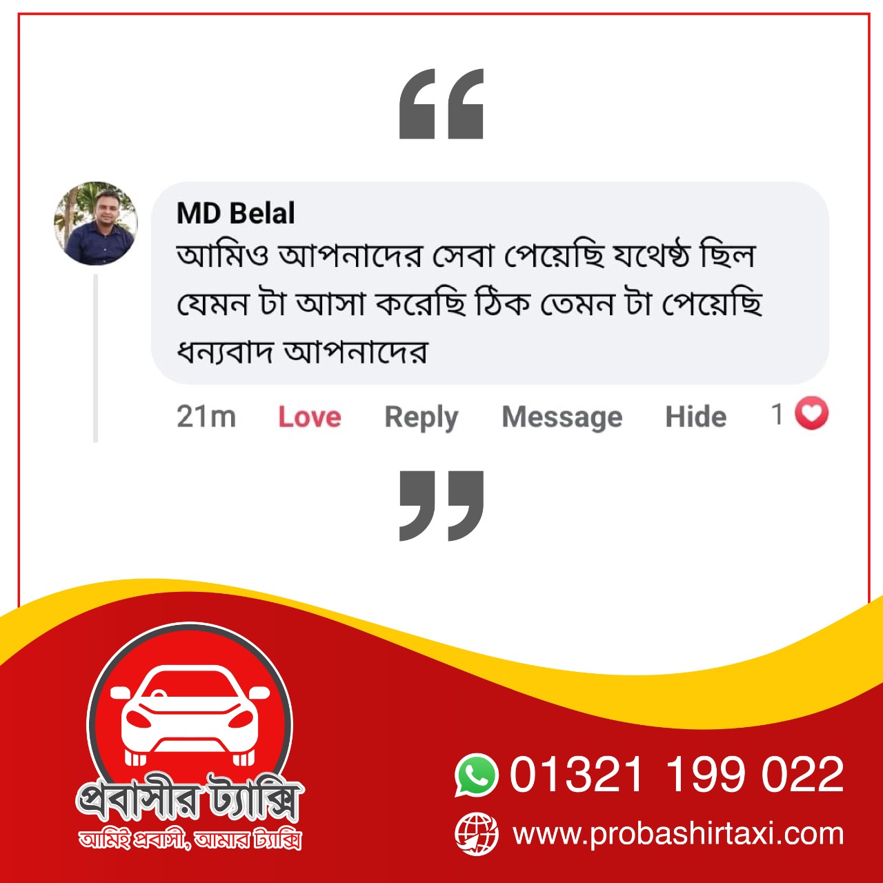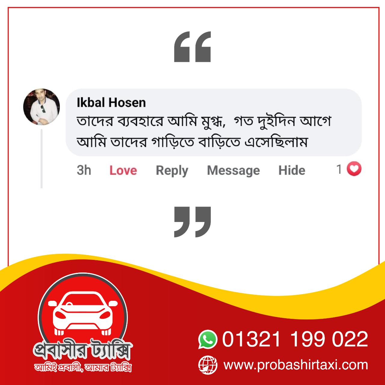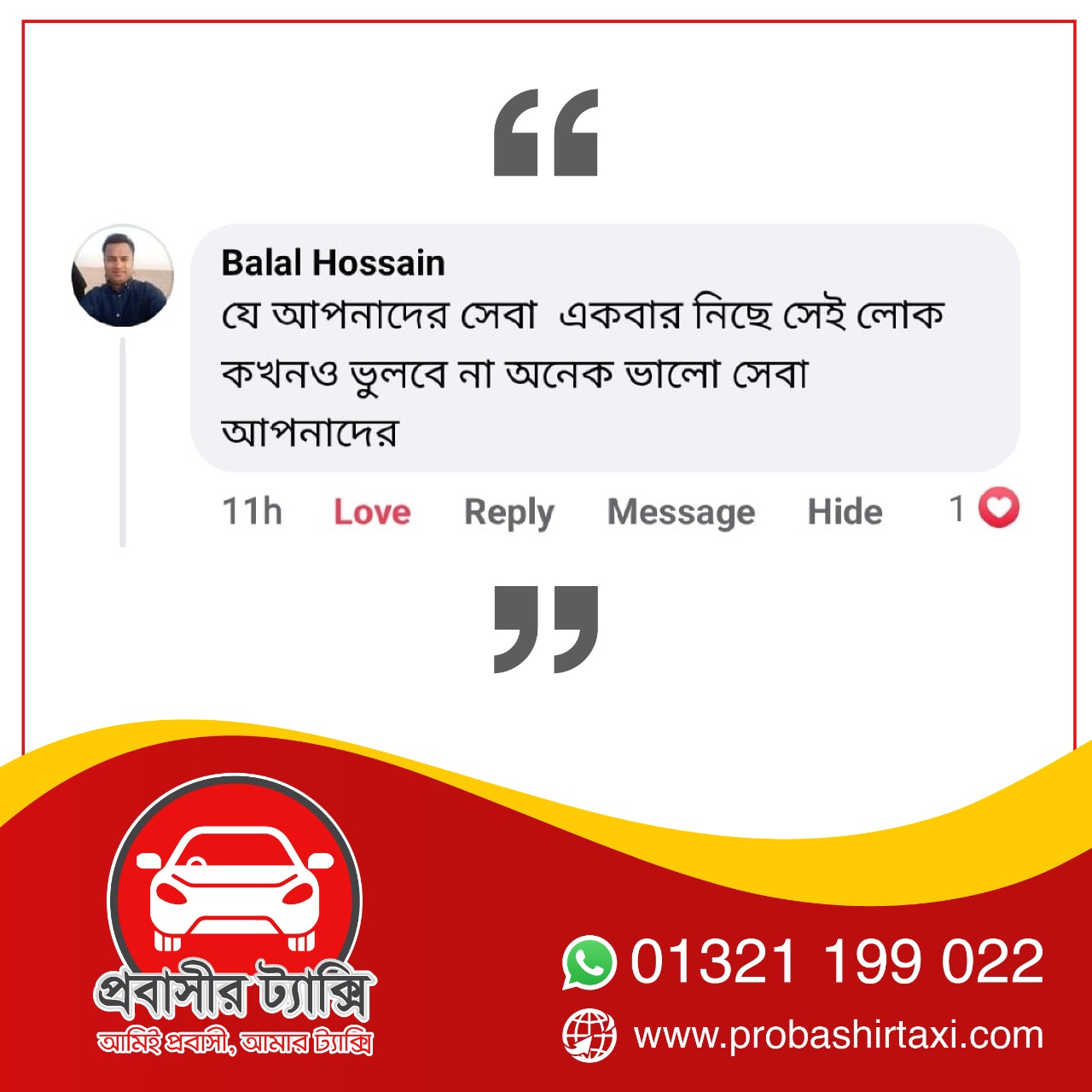 তবে এবার আসার আলো দেখাচ্ছে প্রবাস ফেরত কয়েকজন যুবকের উদ্যোগে প্রতিষ্ঠিত প্রবাসীর ট্যাক্সি নামে একটি কোম্পানি। যে প্রতিষ্ঠানের মাধ্যমে শতভাগ নিরাপদে এবং সাশ্রয়ী ভাড়ায় ঢাকা বিমানবন্দর থেকে গন্তব্যে যেতে পারছেন প্রবাসীরা। উন্নত মানের যাত্রী সেবা এবং মর্যাদা পূর্ণ আচরণে মুগ্ধ প্রবাসীরাও।