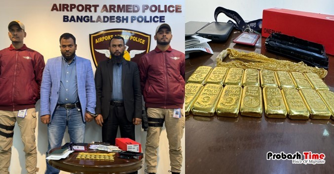 হযরত শাহজালাল আন্তর্জাতিক বিমানবন্দরে প্রায় ০২ কেজি স্বর্ণ সহ একজন হেল্পলাইন স্টাফ এবং একজন যাত্রীকে আটক করেছে এয়ারপোর্ট আর্মড পুলিশ ব্যাটালিয়ন। আজ সন্ধ্যা ০৭ টার সময় বিমানবন্দরের গ্রীন চ্যানেল অতিক্রম করার পর এপিবিএনের গোয়েন্দা দল তাদের দুজনকে আটক করে। এসময় তাদের কাছে ১৬ টি গোল্ডবার এবং ৯৯ গ্রাম গোল্ড জুয়েলারি সহ মোট ১৯৫৫ গ্রাম গোল্ড উদ্ধার করা হয়।