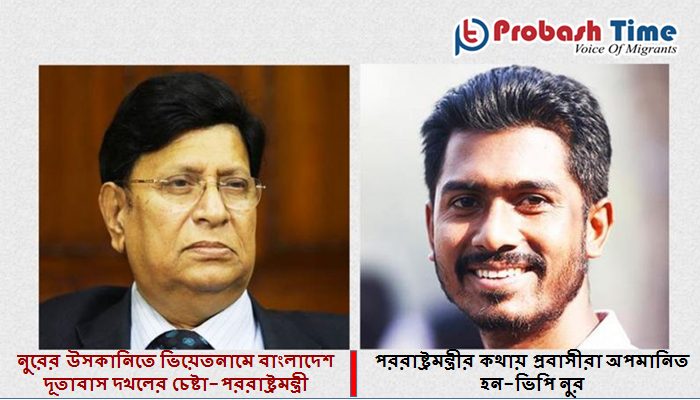 নুরের উসকানিতে ভিয়েতনামে বাংলাদেশ দূতাবাস দখলের চেষ্টা করে ২৭ জন বাংলাদেশি প্রবাসী এমন কথা বলেছেন পররাষ্ট্রমন্ত্রী একে আব্দুল মোমেন। সোমবার (৬ জুলাই) পররাষ্ট্রমন্ত্রী সাংবাদিকদের বলেন, অবৈধভাবে ভিয়েতনামে যাওয়া ২৭ বাংলাদেশি ওই দেশে অবস্থিত বাংলাদেশি মিশন দখল করার চেষ্টা করে। একটি অনলাইন প্ল্যাটফর্মের মাধ্যমে তাদের উসকানি দেন ঢাকা বিশ্ববিদ্যালয়ের কেন্দ্রীয় ছাত্র সংসদের সদ্য সাবেক ভিপি নুরুল হক নুর। গত ২ জুলাই তাদের মধ্যে ১১ বাংলাদেশিকে নিয়ে একটি বিশেষ ফ্লাইট ভিয়েতনাম থেকে ঢাকায় আসে বলেও জানান মন্ত্রী।