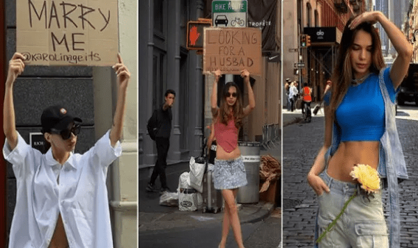 ইনস্টাগ্রামে ভাইরাল ভিডিওতে দেখা যায়, রাস্তায় ‘স্বামী খুঁজছি’ প্ল্যাকার্ড নিয়ে দাঁড়িয়ে রয়েছেন ক্যারোলিনা। আর তা নজরেও পড়ছে অনেকের। খবর- মেট্রো ইউকে’র।