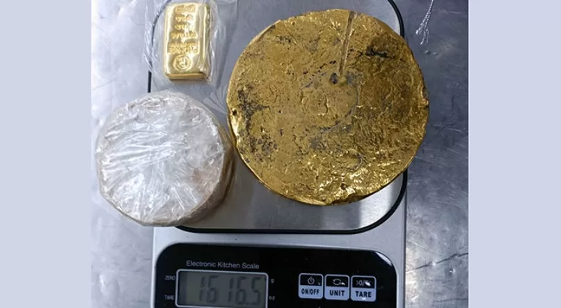 তিনি জানান, বৃহস্পতিবার (১২ অক্টোবর) দুবাই থেকে আসা যাত্রীর লাগেজে আনা একটি এয়ার ফ্রাইয়ারের ভেতর প্রিভেন্টিভ টিমের মাধ্যমে সন্দেহজনক ধাতব পদার্থের অস্তিত্ব পাওয়া যায়। পরবর্তীতে, তা ভেঙে ধাতব চাকতি আকৃতির স্বর্ণপিণ্ড পাওয়া যায়, যার ওজন ১ হাজার ৩৯০ গ্রাম। এছাড়া, একটি সোনার বার, ৯৯ গ্রাম স্বর্ণালংকারসহ মোট ১ হাজার ৬০৫ গ্রাম স্বর্ণ জব্দ করা হয়। এসব স্বর্ণের আনুমানিক বাজারমূল্য ১ কোটি ৬০ লাখ টাকা।