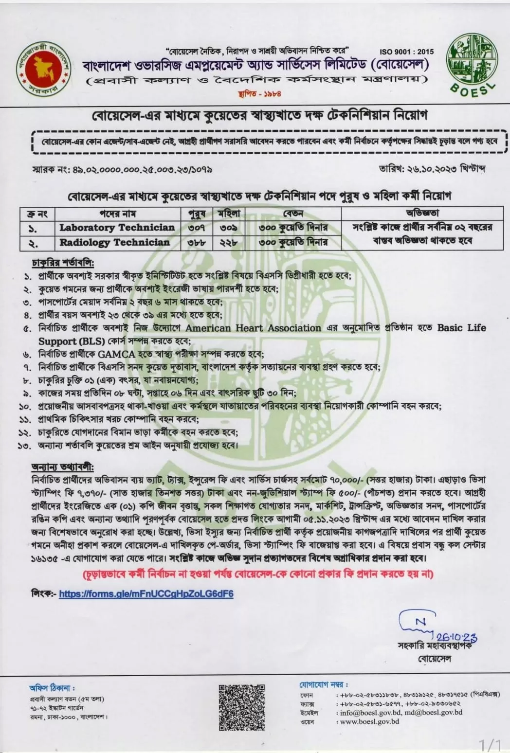 বিজ্ঞপ্তি অনুযায়ী, ল্যাবরেটরি টেকনিশিয়ান পদে ৩০৭ জন পুরুষ ও ৩০৯ জন নারী নিয়োগ দেওয়া হবে। আর রেডিওলজি টেকনিশিয়ান পদে ৩৮৮ জন পুরুষ ও ২২৮ জন নারী নিয়োগ দেওয়া হবে। উভয় পদেই বেতন দেওয়া হবে ৩০০ কুয়েতি দিনার। সংশ্লিষ্ট কাজে প্রার্থীর সর্বনিম্ন দুই বছরের বাস্তব অভিজ্ঞতা থাকতে হবে।
