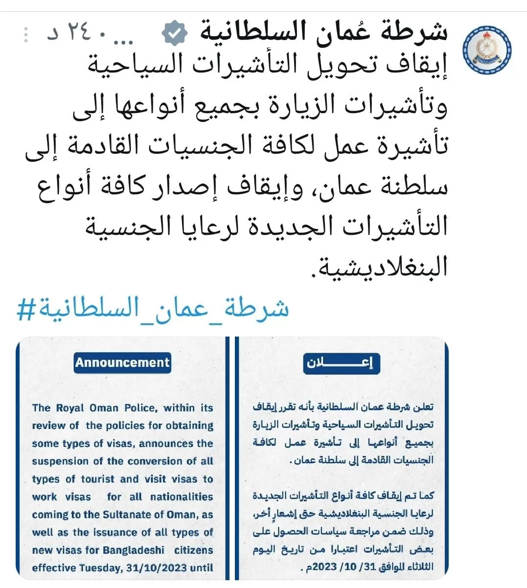 অনির্দিষ্টকালের জন্য বাংলাদেশিদের জন্য সব ধরণের ভিসা বন্ধ করেছে ওমান। মঙ্গলবার দেশটির রয়্যাল ওমান পুলিশের বরাত দিয়ে ওমান অবজারভার এ তথ্য নিশ্চিত করেছে। এক বিবৃতিতে রয়্যাল ওমান পুলিশ জানিয়েছে, এই সিদ্ধান্ত মঙ্গলবার থেকেই কার্যকর হবে।