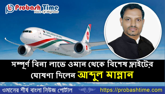 মহামারী করোনা প্রাদুর্ভাবে চাকরি হারিয়ে অথবা নানা সমস্যায় যেসব প্রবাসী ওমান থেকে দেশে আসতে চান, তাদের জন্য সম্পূর্ণ অলাভজনক ও সেবামূলক কাজের জন্য ব্যক্তিগত খরচে বিশেষ ফ্লাইটের ব্যবস্থা করার ঘোষণা দেন ওমানের বিশিষ্ট ব্যবসায়ী কিং জালান কোম্পানির চেয়ারম্যান আব্দুল মান্নান। গতকাল (সোমবার) প্রবাস টাইমের লাইভে এসে তিনি এই ঘোষণা দেন।