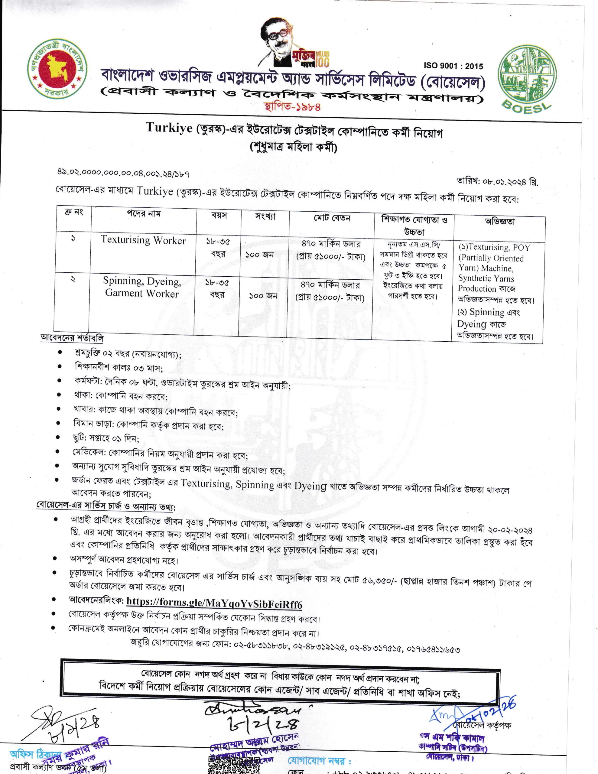 সরকারিভাবে বাংলাদেশ ওভারসিজ এমপ্লয়মেন্ট অ্যান্ড সার্ভিসেস লিমিটেড- বোয়েসেলের মাধ্যমে দক্ষ নারী কর্মী নিয়োগ দেবে তুরস্ক।