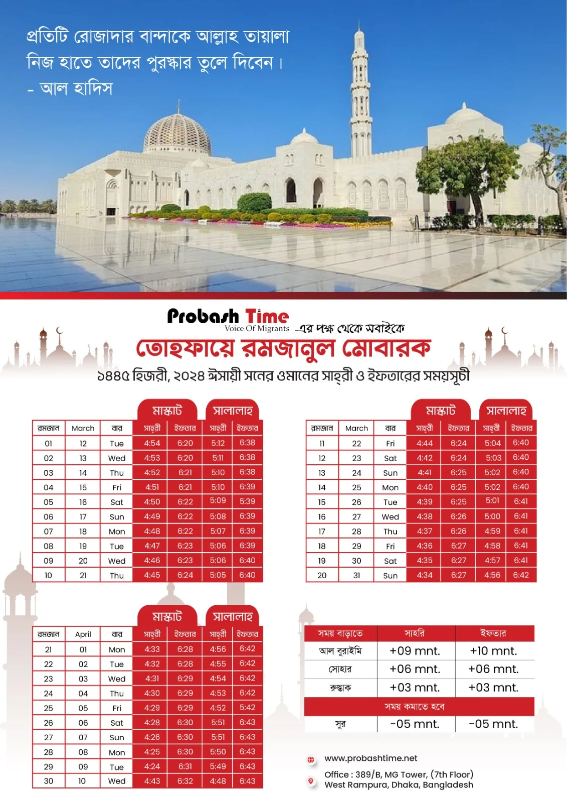 তবে চাঁদ দেখার ওপর নির্ধারিত হয় ১ রমজান। দূরত্ব অনুযায়ী সময়ের সঙ্গে যোজন বিয়োজন করে ওমানের প্রধান দুই শহরের প্রবাসীদের সাহ্রী ও ইফতার সময়সূচি তৈরি করা হয়েছে।