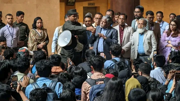 আন্দোলতরত শিক্ষার্থীদের সাথে কথা বলেন বিশ্ববিদ্যালয়ের উপাচার্য অধ্যাপক ড. আতিকুল ইসলাম। ছবি: সংগৃহীত