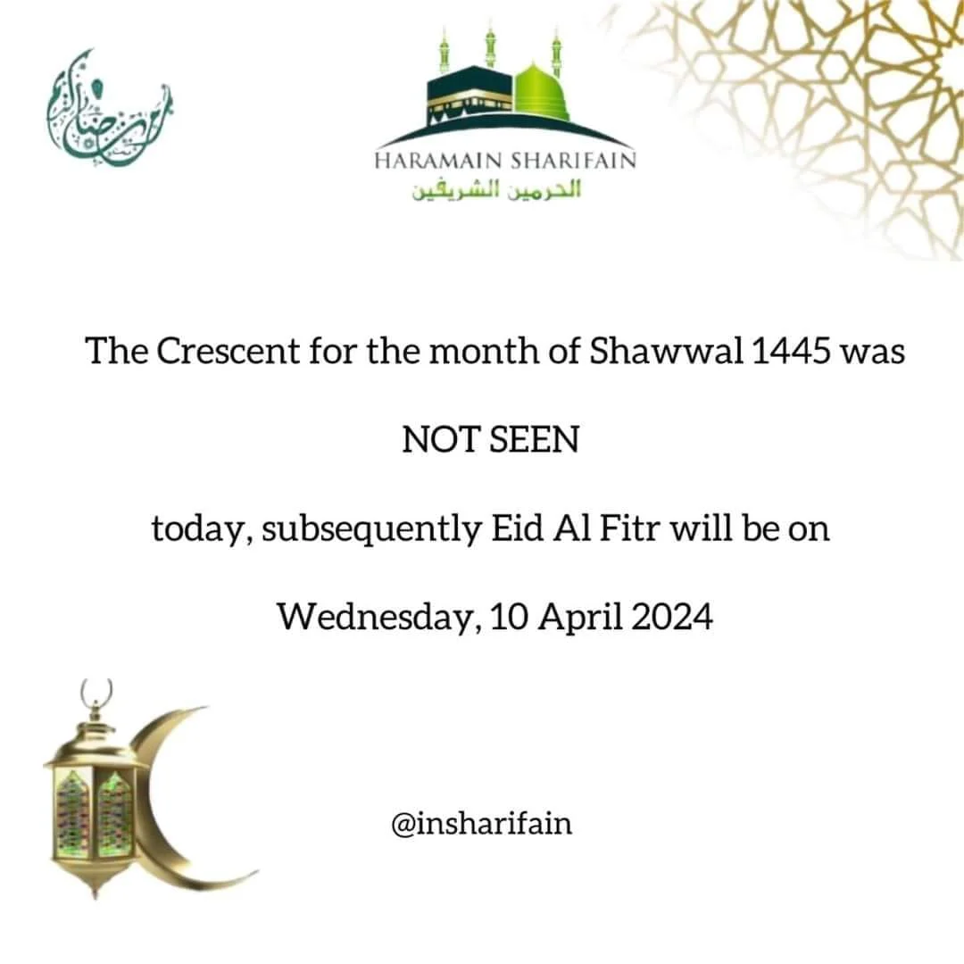 সোমবার (৮ এপ্রিল) বাংলাদেশ সময় রাত ৯ টা ২০ মিনিটে এক পোস্টে ইনসাইড দ্য হারামাইনের পক্ষ থেকে বলা হয়েছে, ‘আজ সৌদি আরবের কোথাও শাওয়াল মাসের চাঁদ দেখা যায়নি।’