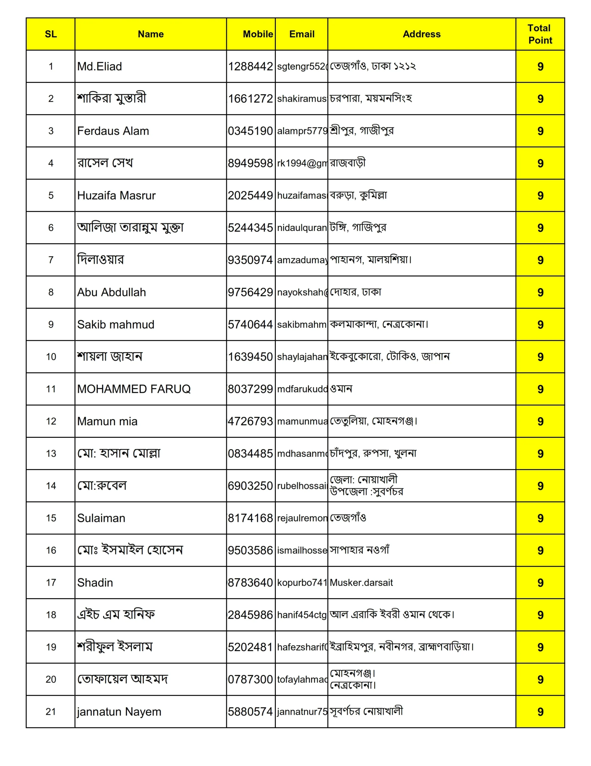 ২৯তম দিনের কুইজে সম্ভাব্য বিজয়ীদের তালিকা