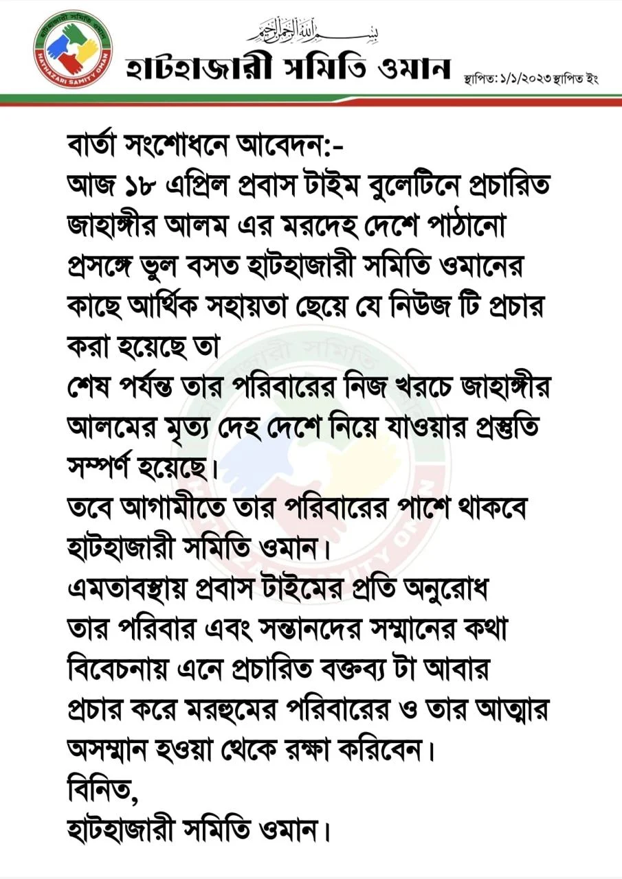 ১৮ এপ্রিল, ২০২৪ তারিখের প্রবাস টাইম বুলেটিনে “ওমানে বাংলাদেশির আকস্মিক মৃত্যু, লাশ পরিবহনের দায়িত্ব নিলো হাটহাজারী সমিতি” শিরোনামে প্রচারিত সংবাদে জাহাঙ্গীর আলমের লা*শ পরিবহনে হাটহাজারি সমিতির দায়িত্ব নেওয়ার তথ্যটি যথাযথ নয়।