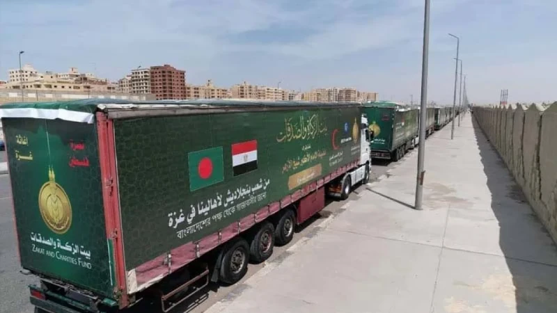 লাল সবুজের পতাকা ও মিশরে বাংলাদেশি চ্যারাটি ফান্ড ‘ওয়ার্ল্ড ওয়ান উম্মাহ ফাউন্ডেশন’ এবং ‘বাংলাদেশ ফিলিস্তিন মৈত্রী সংস্থা’র ব্যানার টানানো ৩৫টি লরিতে পাঁচ কোটি টাকারও বেশি, সাতশত টন জরুরি ওষুধ ও ত্রাণ-সামগ্রী নিয়ে ১১৫টি লরিভর্তি একটি ত্রাণ বহর রাফার উদ্দেশ্যে কায়রো ত্যাগ করেছে।