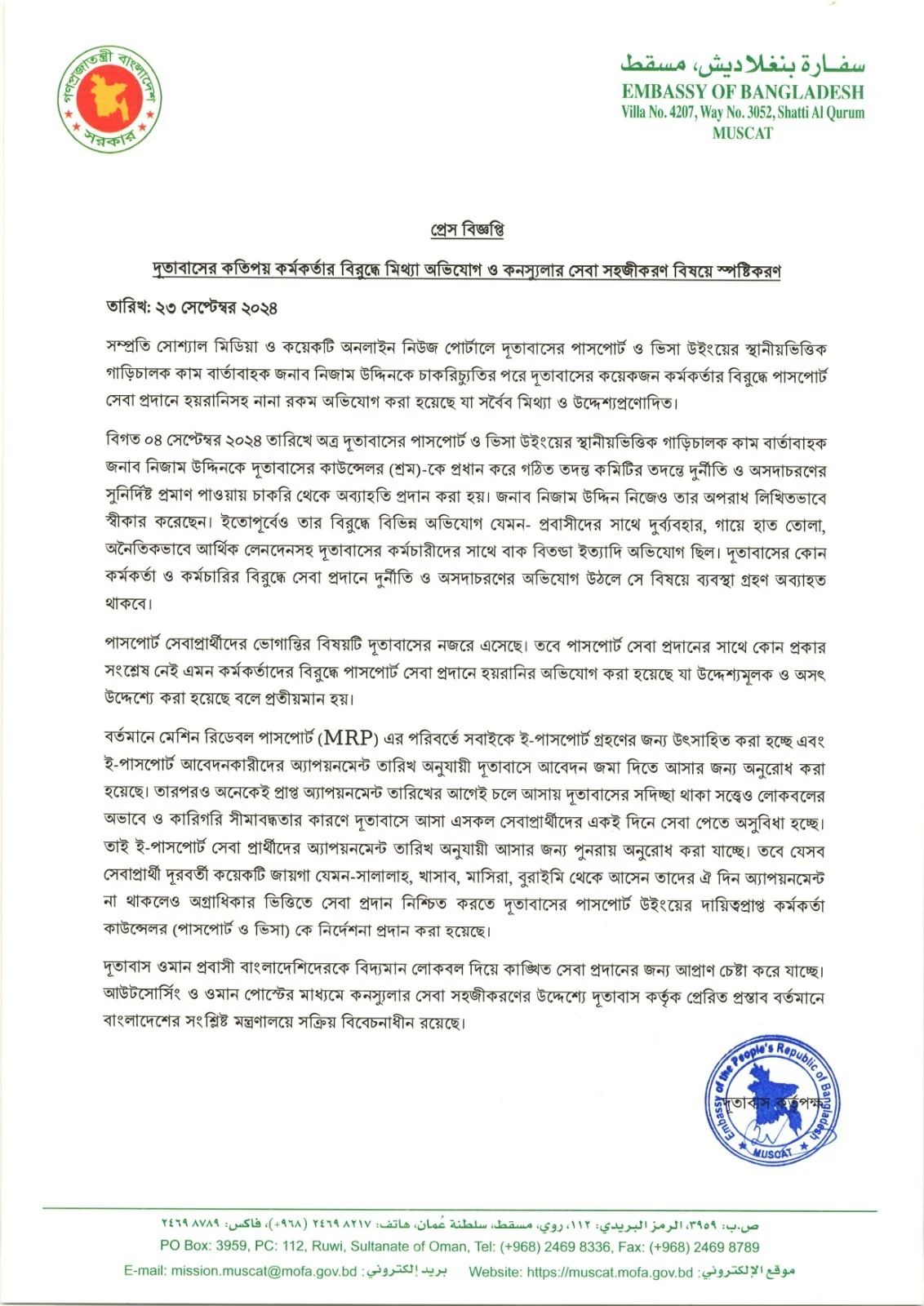 ওমানের বাংলাদেশ দূতাবাসের কর্মকর্তাদের বিরুদ্ধে ওঠা অভিযোগের ব্যাখ্যা দিয়েছে দূতাবাস কর্তৃপক্ষ। সোমবার (২৩ সেপ্টেম্বর) এক প্রেস বিজ্ঞপ্তির মাধ্যমে দূতাবাসের বক্তব্য তুলে ধরা হয়। এতে বলা হয়, সম্প্রতি সোশ্যাল মিডিয়া ও কয়েকটি অনলাইন নিউজ পোর্টালে দূতাবাসের পাসপোর্ট ও ভিসা উইংয়ের স্থানীয়ভিত্তিক গাড়িচালক কাম বার্তাবাহক জনাব নিজাম উদ্দিনকে চাকরিচ্যুতির পরে দূতাবাসের কয়েকজন কর্মকর্তার বিরুদ্ধে পাসপোর্ট সেবা প্রদানে হয়রানিসহ নানা রকম অভিযোগ করা হয়েছে যা সর্বৈব মিথ্যা ও উদ্দেশ্যপ্রণোদিত।