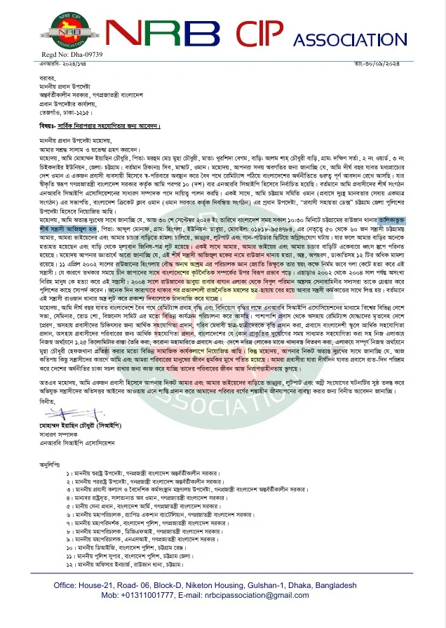 জীবন ও সম্পদের নিরাপত্তা চেয়ে অন্তর্বর্তী সরকারের কাছে চিঠি লিখেছেন ওমান প্রবাসী ইয়াসিন চৌধুরী সিআইপি। সোমবার (৩০ সেপ্টেম্বর) এনআরবি সিআইপি এসোসিয়েশনের প্যাডে তার বাড়িতে হামলার বর্ণনা দিয়ে নিরাপত্তা সহায়তার আবেদন করেন তিনি। এর আগে প্রবাসী ইয়াসিনের রাউজানের বাড়িতে হামলা, ভাঙচুর এবং অগ্নিসংযোগ করে দুর্বৃত্তরা। সোমবার (৩০ সেপ্টেম্বর) সকালে রাউজান উপজেলার চিকদাইর ইউনিয়নের দক্ষিণ সর্তা গ্রামে এই ঘটনা ঘটে। পরে ফায়ার সার্ভিস ঘটনাস্থলে পৌঁছে আগুন নিয়ন্ত্রণে আনে।