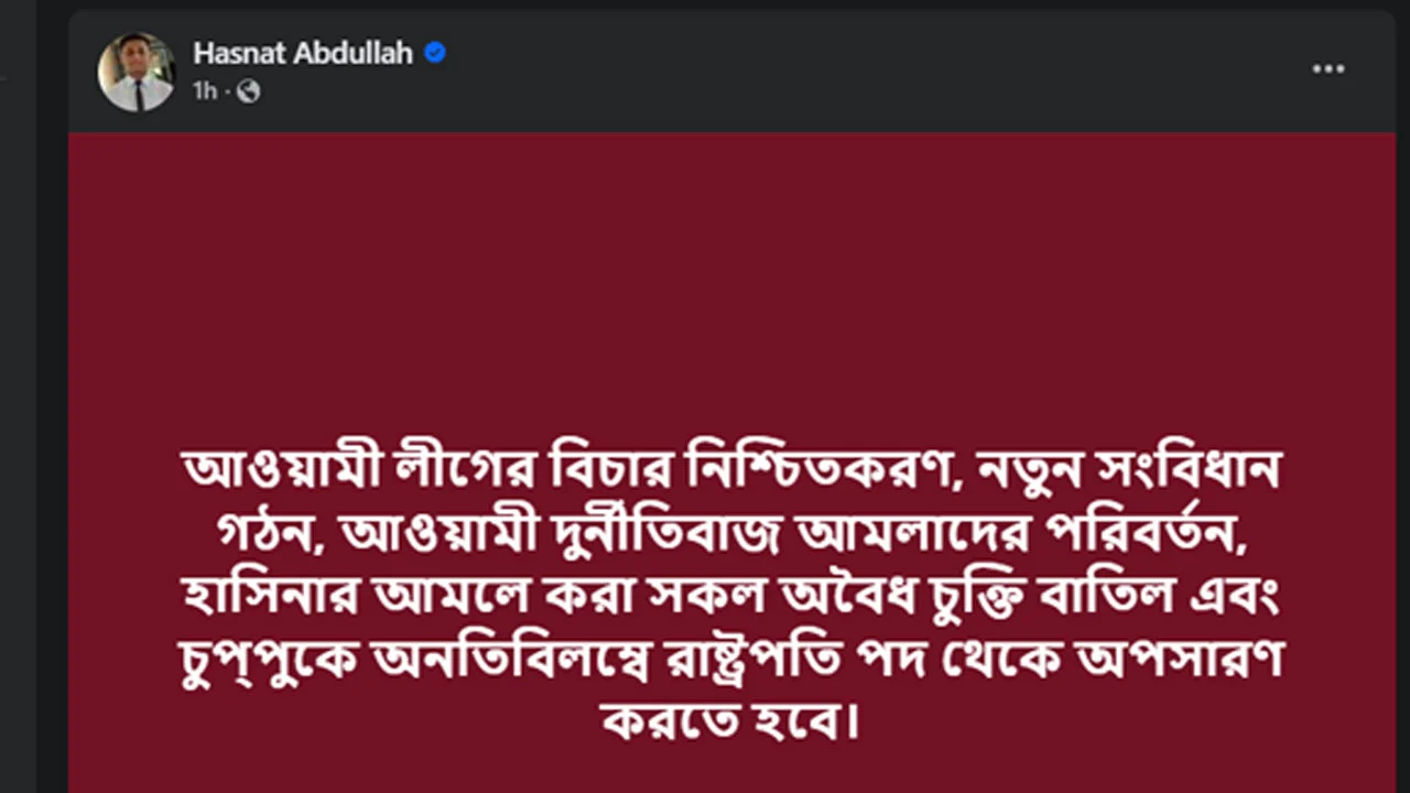 হাসনাত আবদুল্লাহ বলেন, আওয়ামী লীগের বিচার নিশ্চিতকরণ, নতুন সংবিধান গঠন, আওয়ামী দুর্নীতিবাজ আমলাদের পরিবর্তন, হাসিনার আমলে করা সব অবৈধ চুক্তি বাতিল এবং মো. সাহাবুদ্দিনকে অনতিবিলম্বে রাষ্ট্রপতির পদ থেকে অপসারণ করতে হবে।