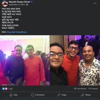 তবে এ বিষয় নিয়ে চুপ থাকতে দেখা গেছে চঞ্চল চৌধুরীকে। এরপর বেশ সমালোচনা শিকার হয়েছিলেন তিনি। এবার ওপার বাংলার টেলিভিশন উপস্থাপন ময়ূখ রঞ্জন ঘোষের সঙ্গে পুরোনো কিছু ছবি সামাজিক যোগাযোগ মাধ্যমে ভাইরাল হয়েছে।