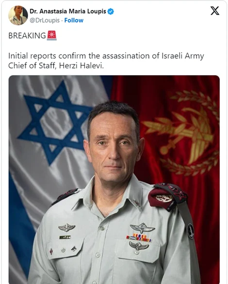 মারিয়া লুপিস লিখেছেন, ‘প্রাথমিক প্রতিবেদনে ইসরায়েলি সেনাবাহিনীর চিফ অব স্টাফ হারজি হালেভিকে হত্যার বিষয়টি নিশ্চিত করা হয়েছে। লুপিস আইডিএফ প্রধান হালেভির একটি ছবিও শেয়ার করেছেন।