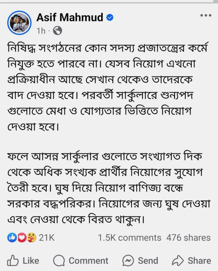ফেসবুক পোস্টে আসিফ মাহমুদ লেখেন, ‘নিষিদ্ধ সংগঠনের কোনো সদস্য প্রজাতন্ত্রের কর্মে নিযুক্ত হতে পারবে না। যেসব নিয়োগ এখনো প্রক্রিয়াধীন আছে, সেখান থেকেও তাদের বাদ দেওয়া হবে। পরবর্তী সার্কুলারে শূন্যপদগুলোয় মেধা ও যোগ্যতার ভিত্তিতে নিয়োগ দেওয়া হবে।