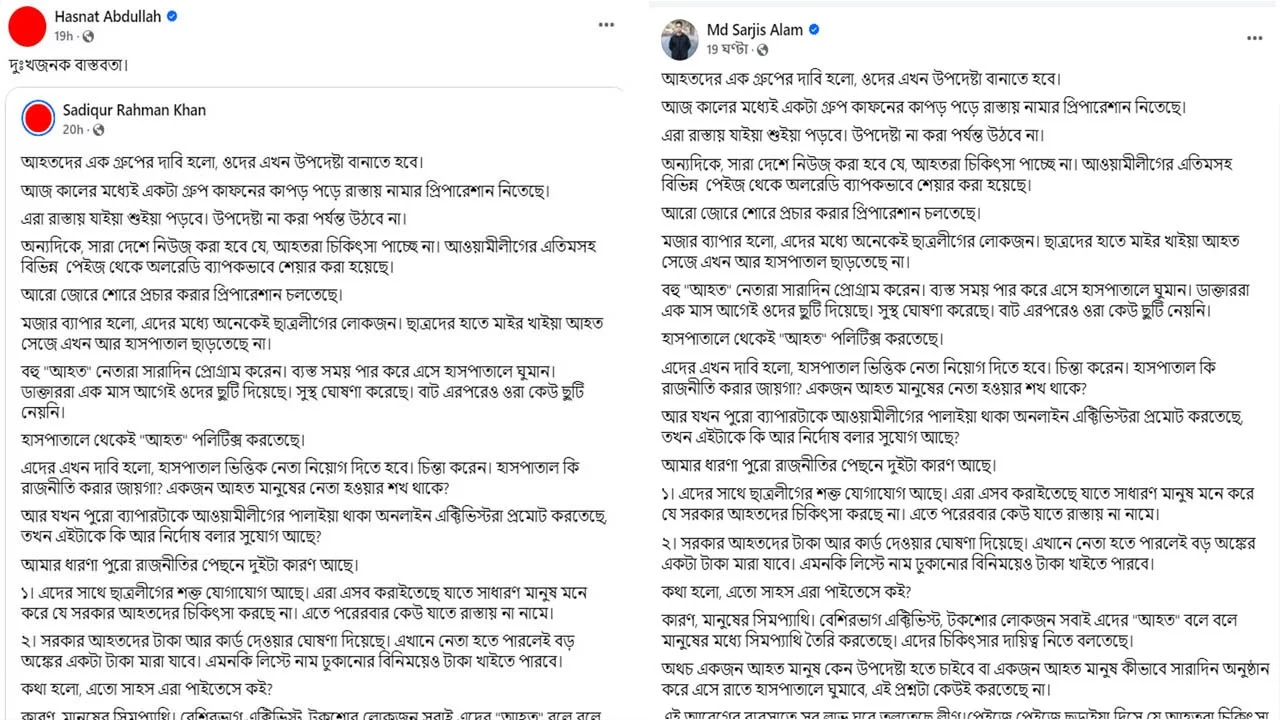 এদের এখন দাবি হলো, হাসপাতালভিত্তিক নেতা নিয়োগ দিতে হবে। চিন্তা করেন। হাসপাতাল কি রাজনীতি করার জায়গা? একজন আহত মানুষের নেতা হওয়ার শখ থাকে?